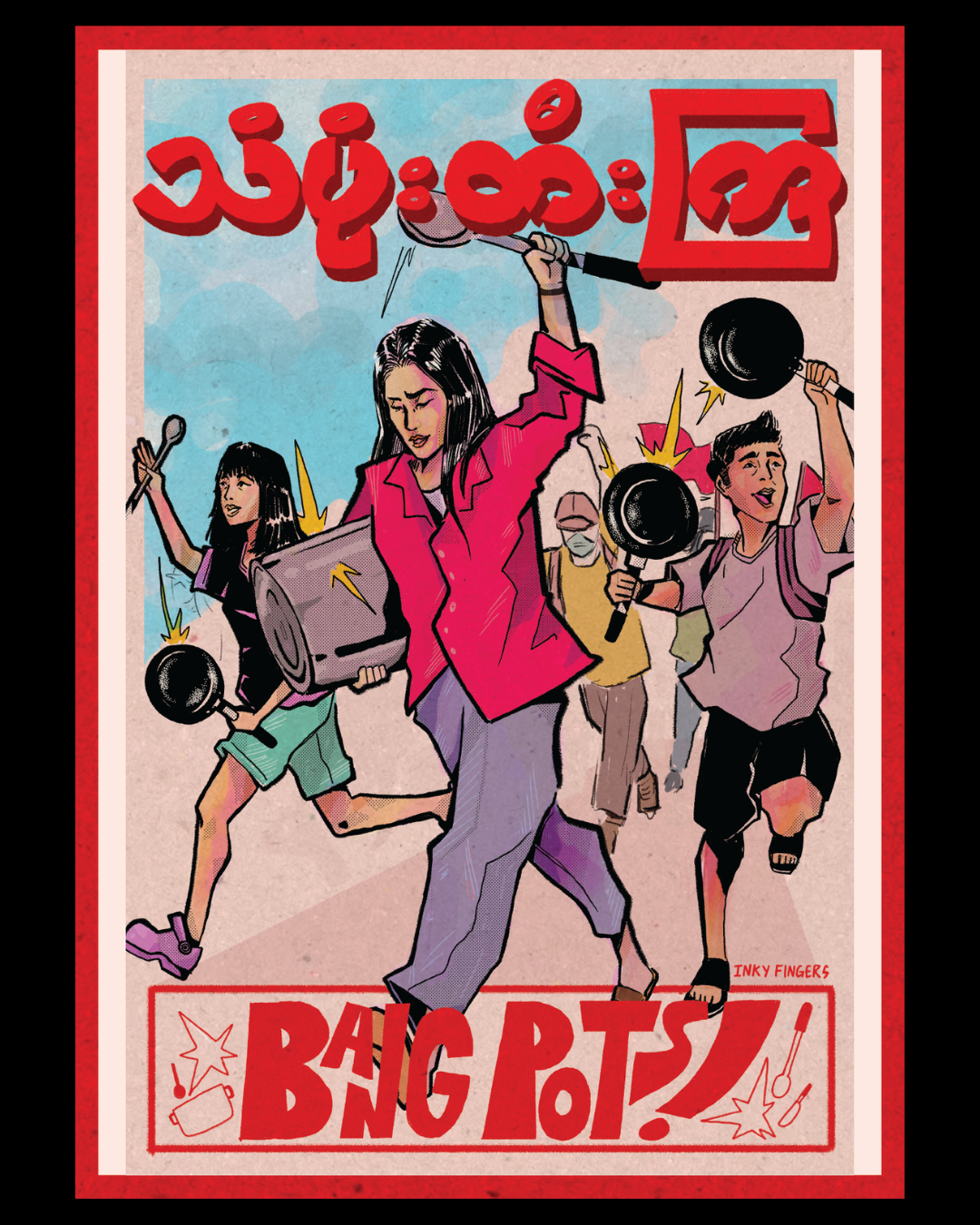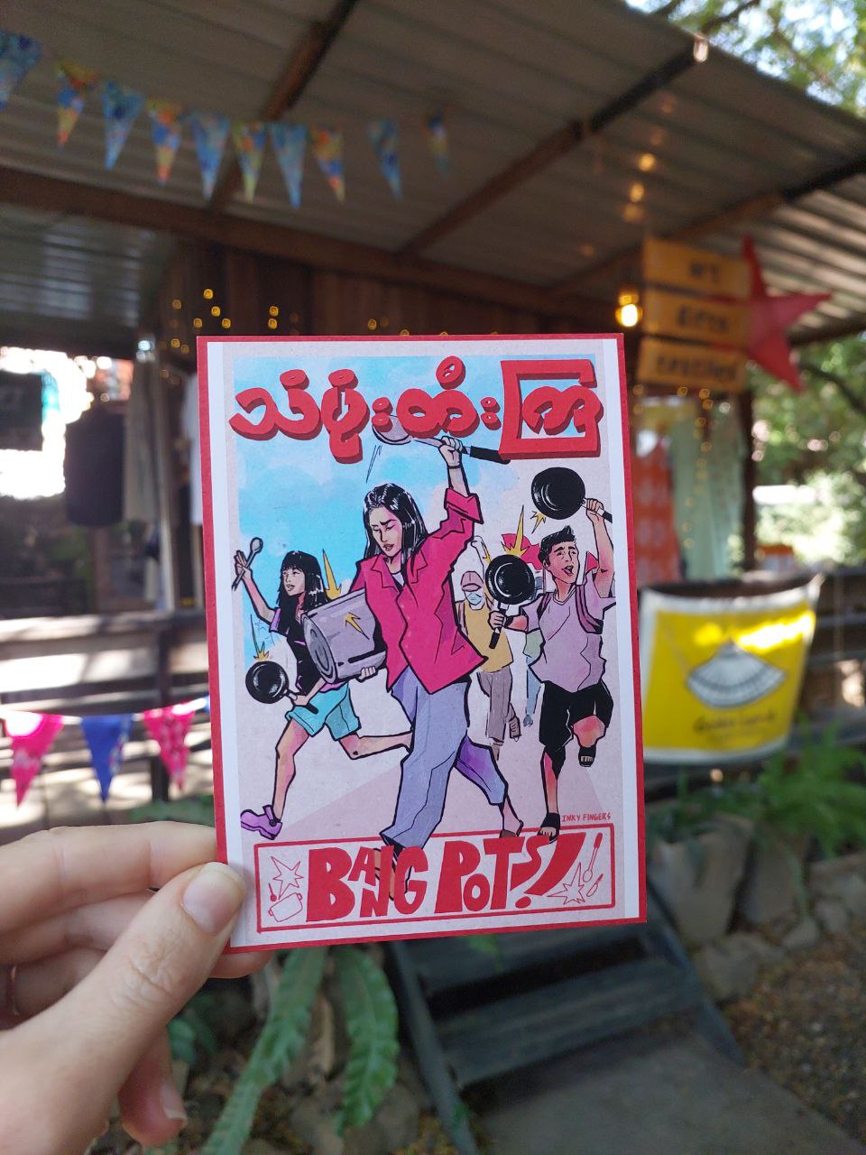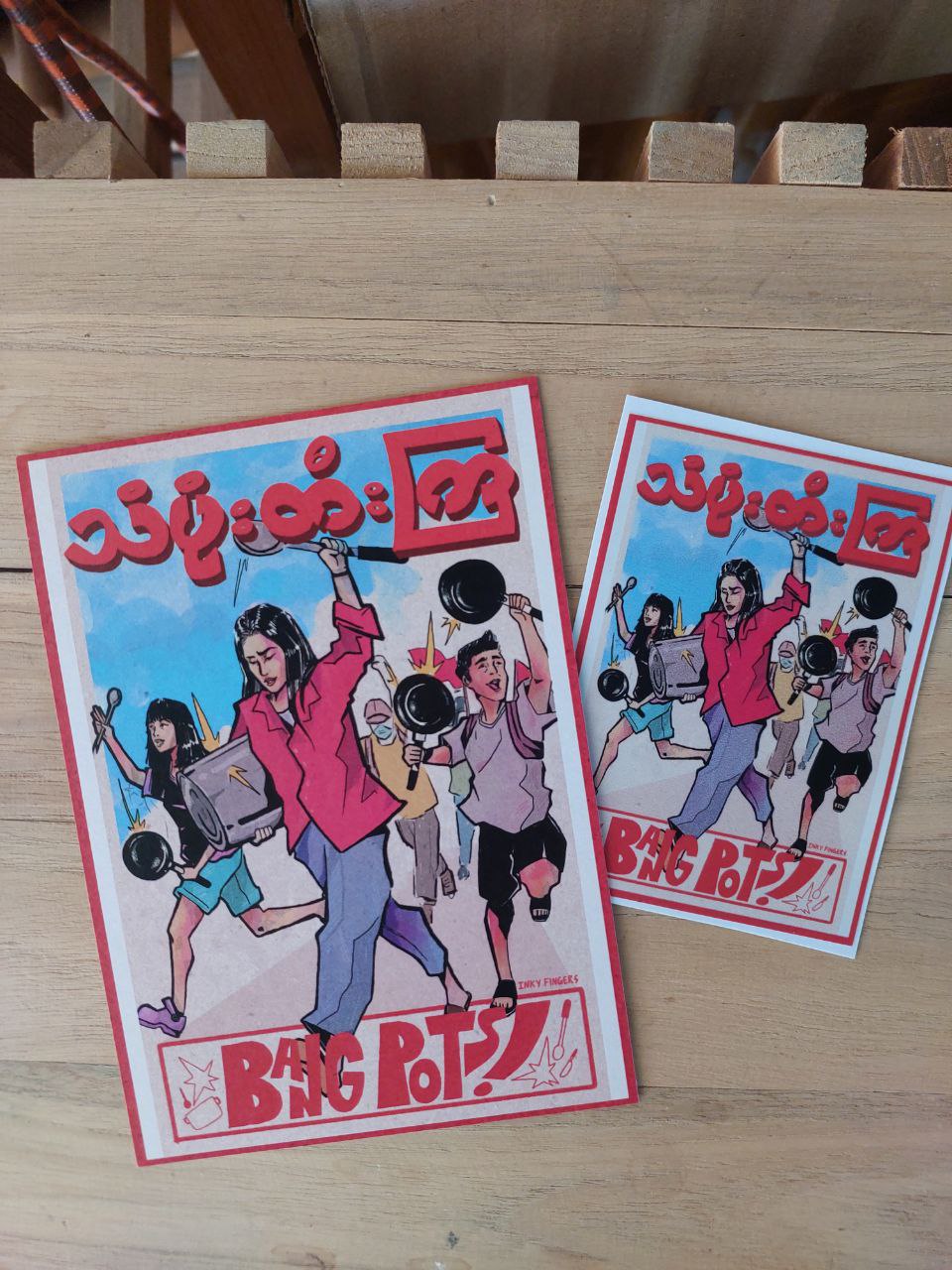The Burmese text on the poster reads, “Let’s Bang Pots.”